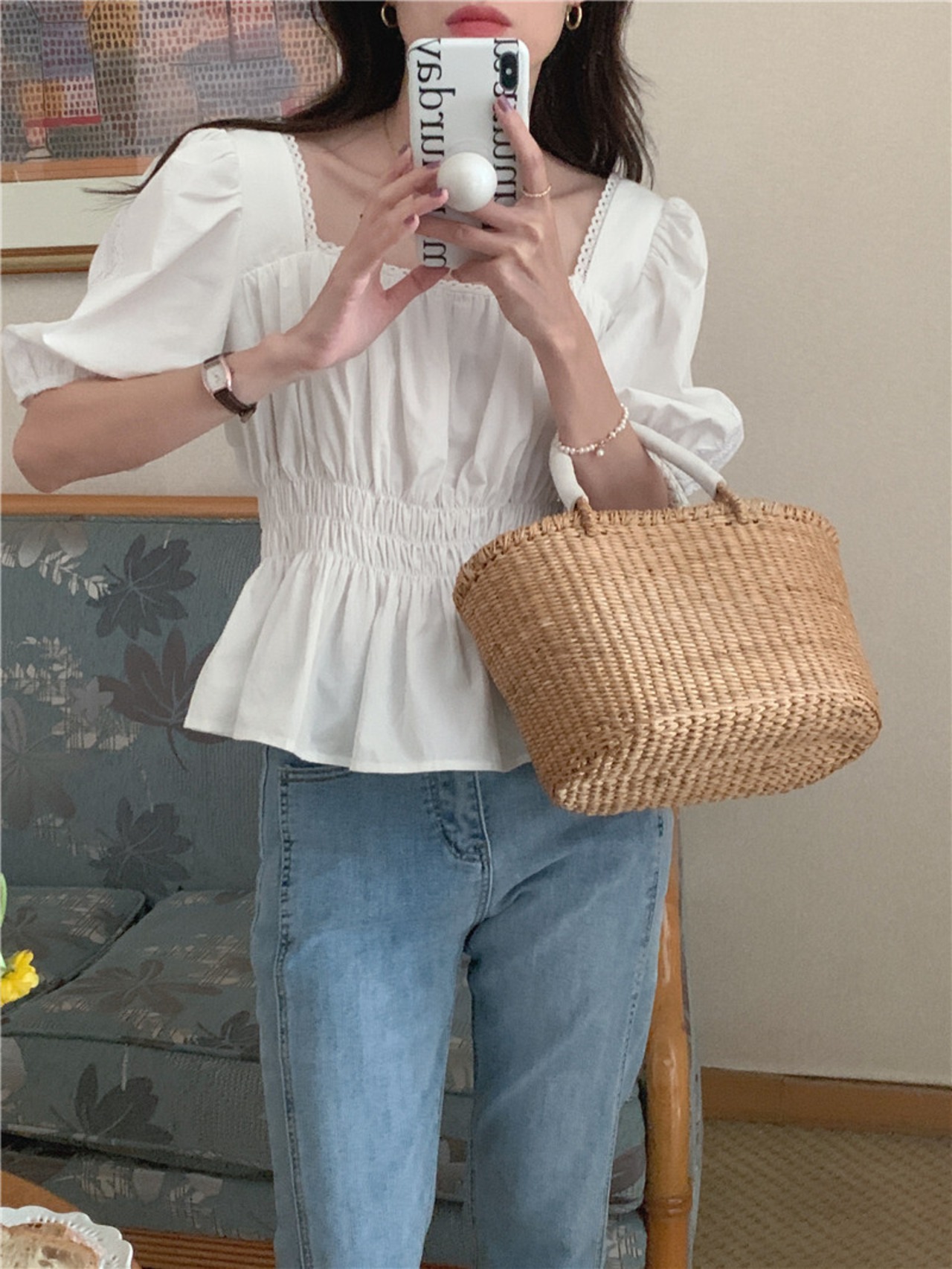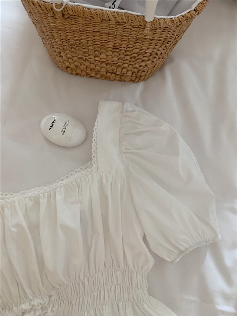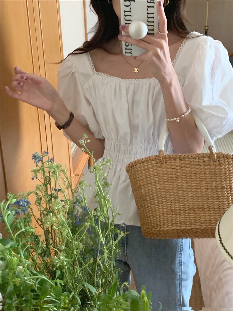 ガーリーなスクエアネックにはレースをあしらったおすすめのアイテムです。