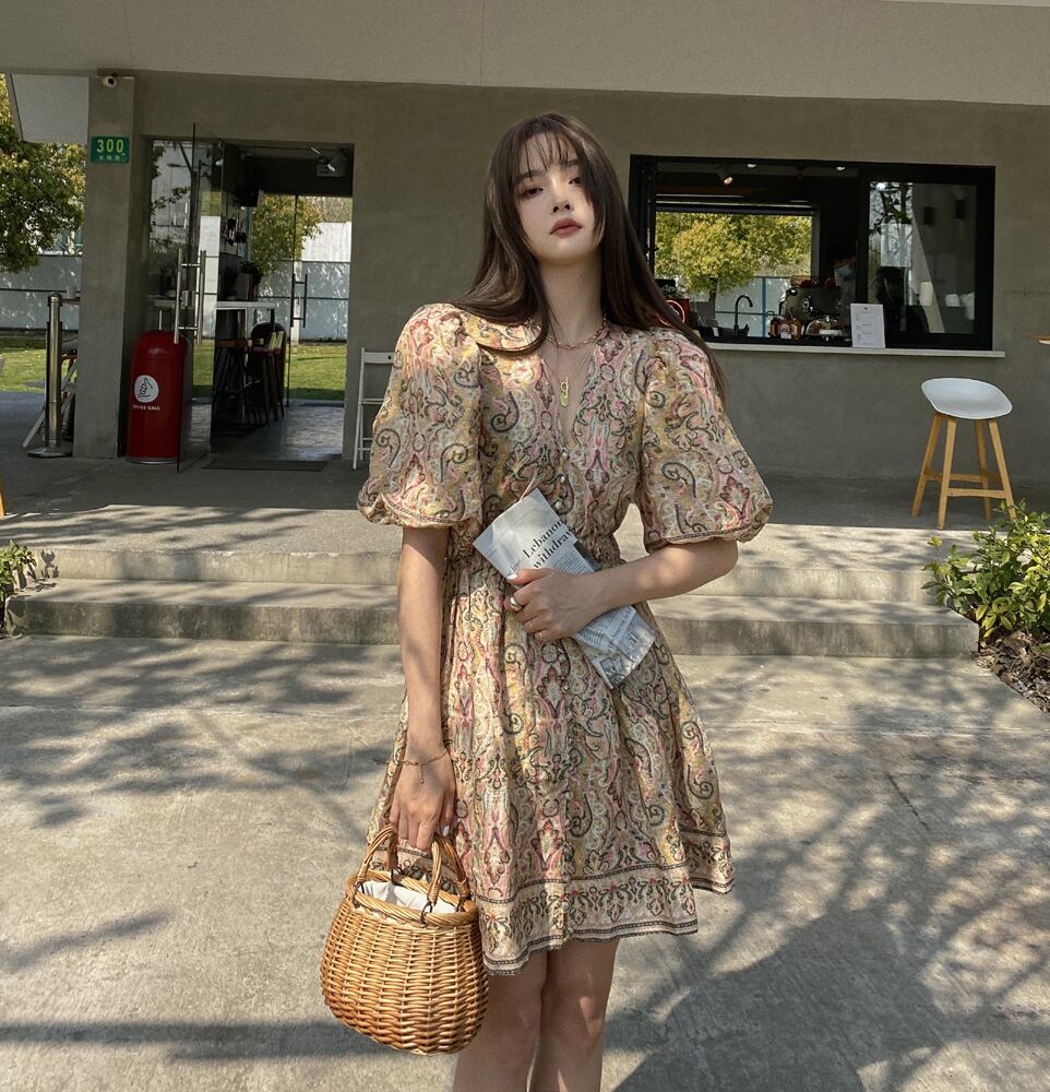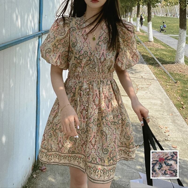くすんだ淡いレトロカラーをベースにした総柄デザインのミニワンピースです!