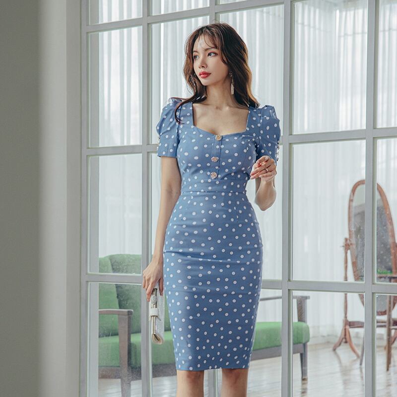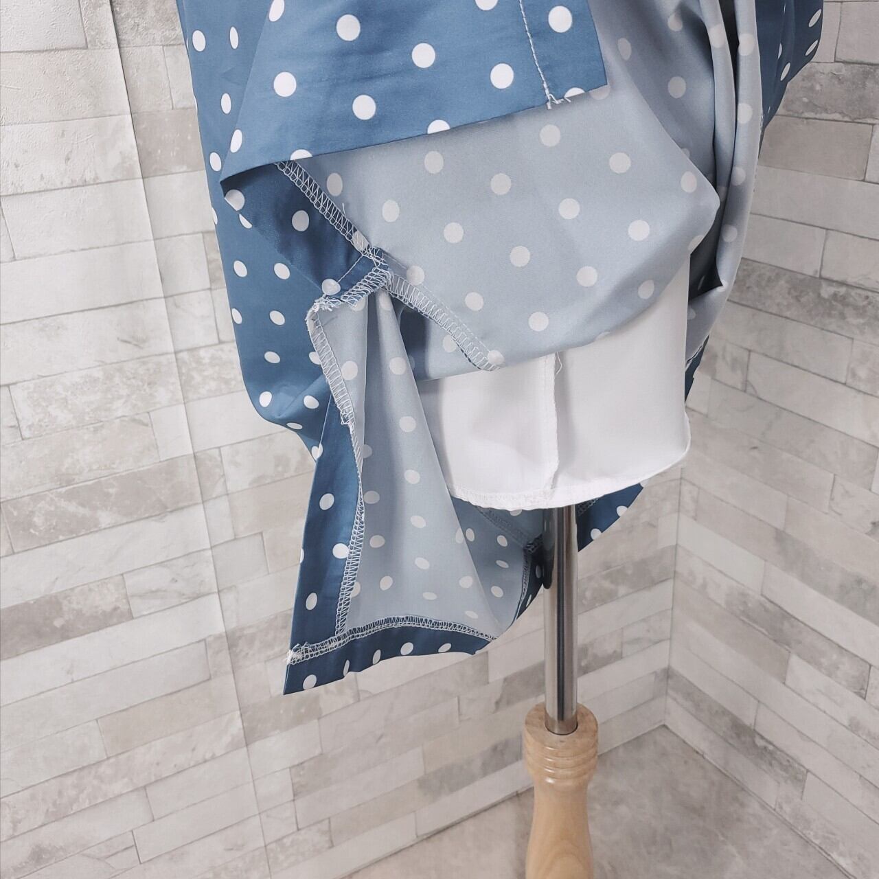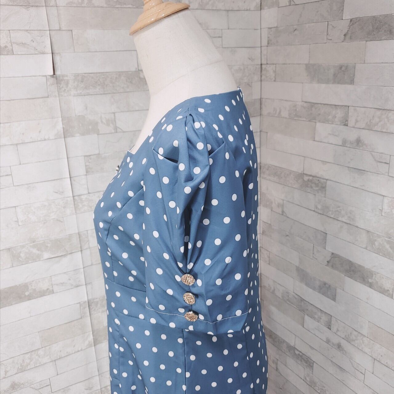 ポルカドット柄をたっぷりあしらったデニムカラーのタイトワンピースのご紹介です!