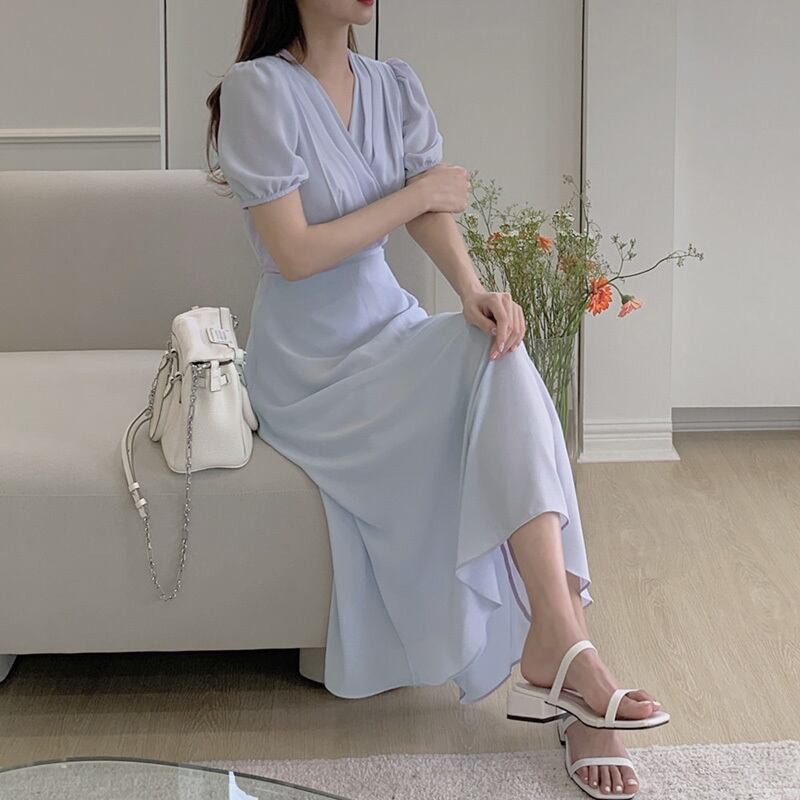 爽やかな雰囲気を纏えるVネックの無地ロングワンピースのご紹介です♪