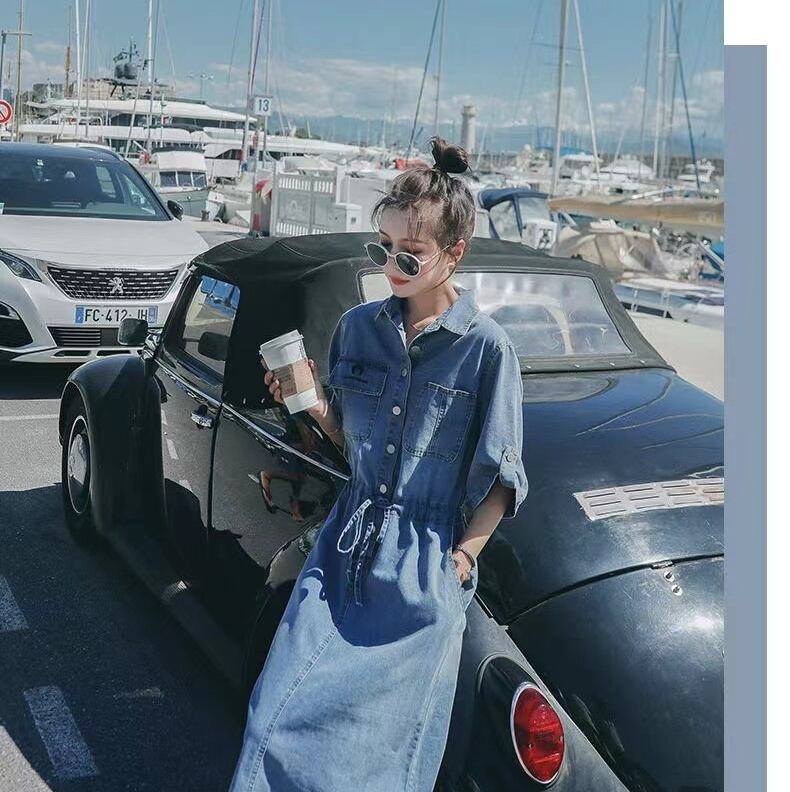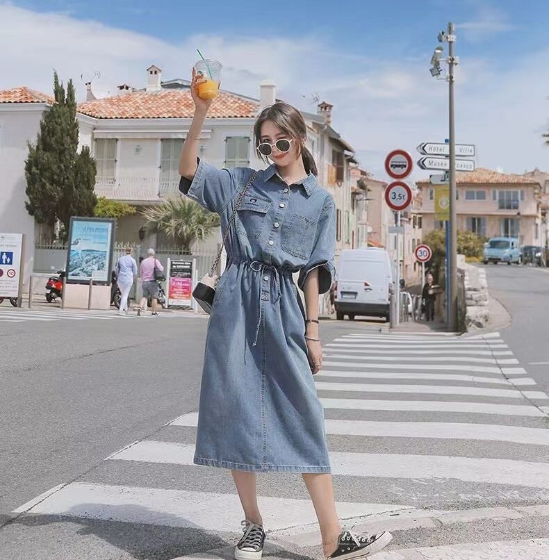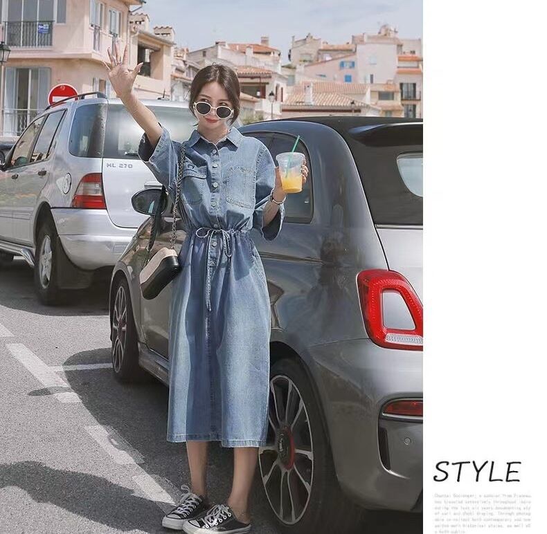 ハイウエスト位置にタイをあしらった襟付きのミモレ丈ワンピースです♪