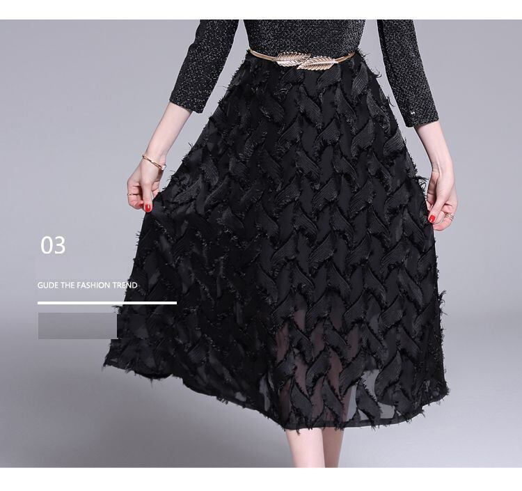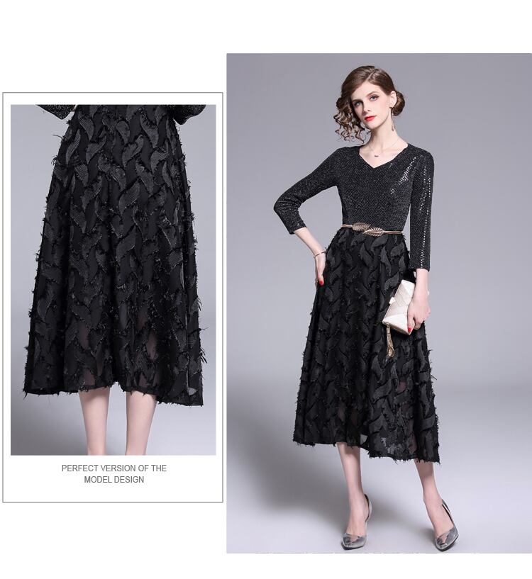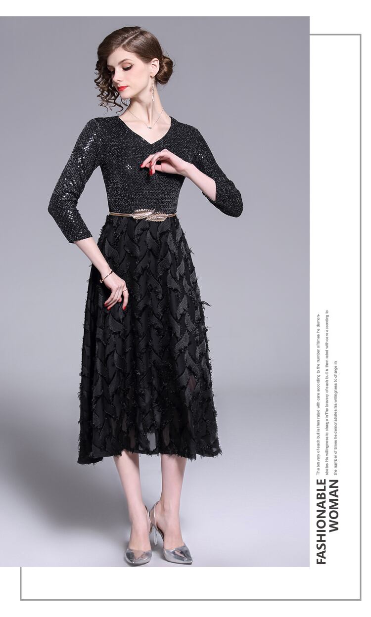 重たく見せないトップスラインやVネック、スカートの柄感がおしゃれな一枚です。