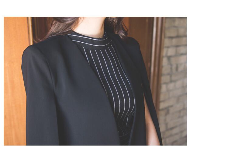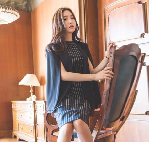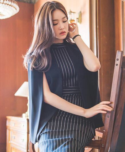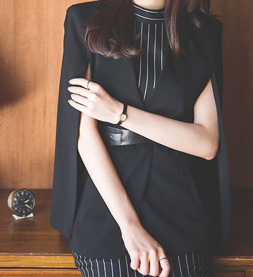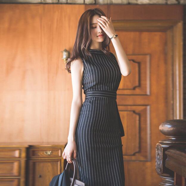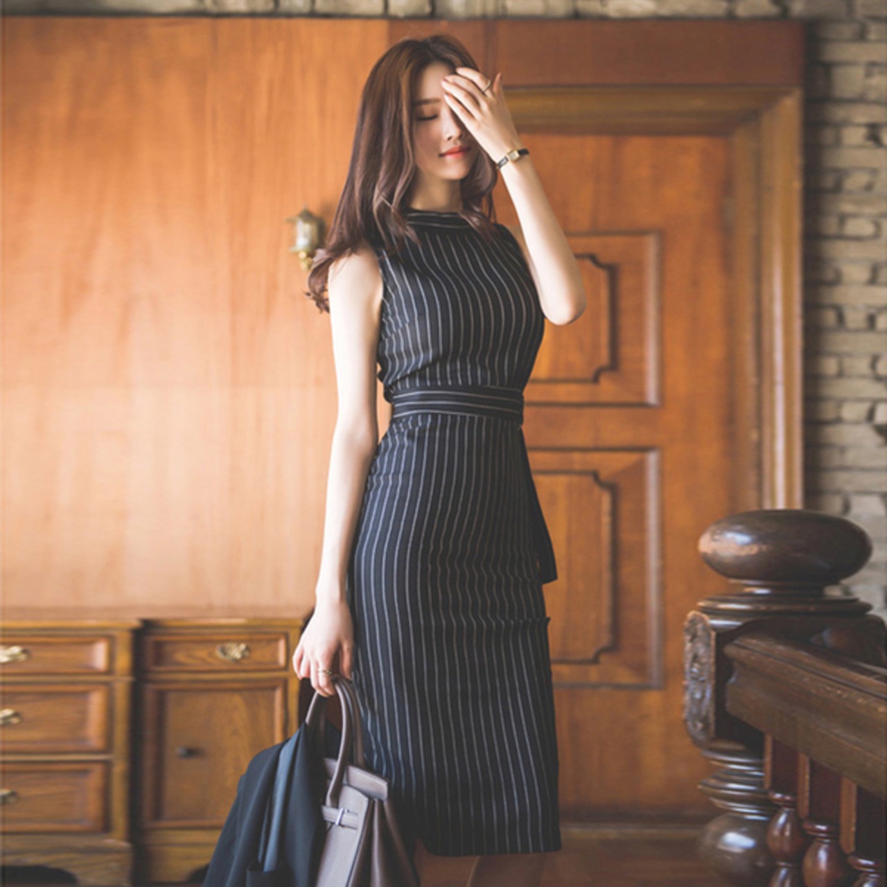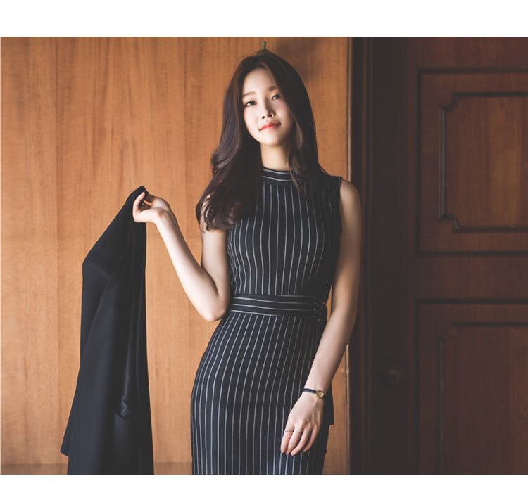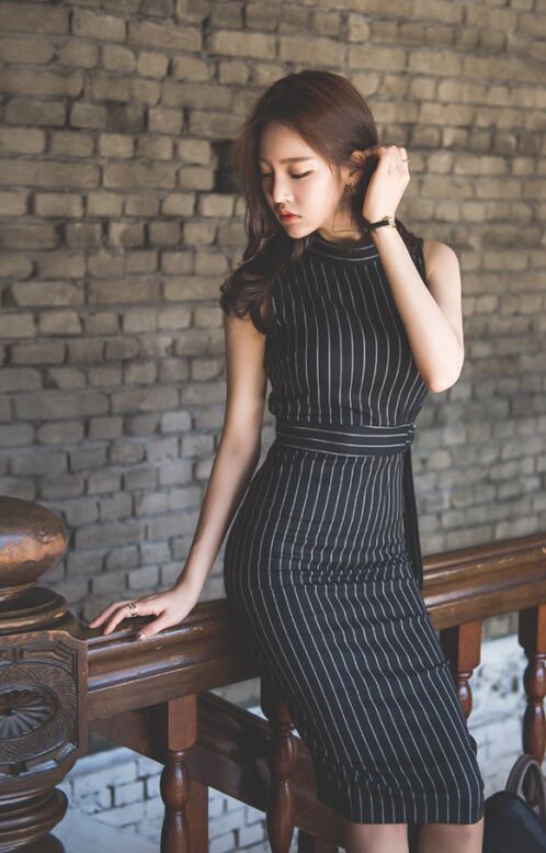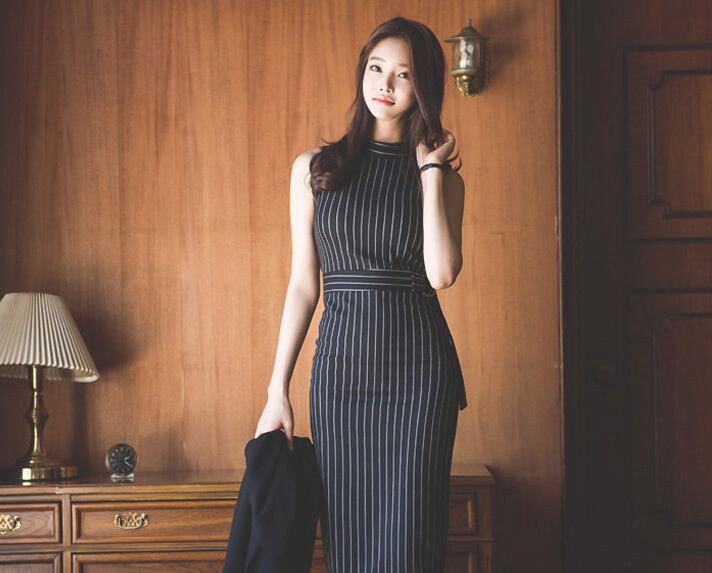 タイトなシルエットに細めストライプとハイウエストベルトが