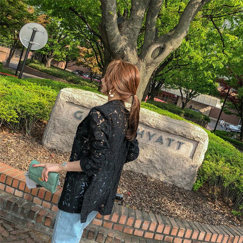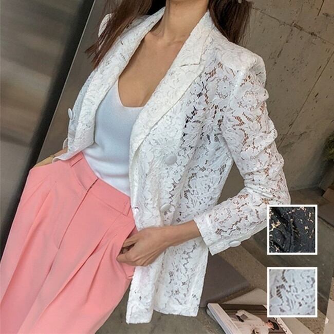 ジャケットのきっちりフォルムとレースのこなれ感がポイント。
