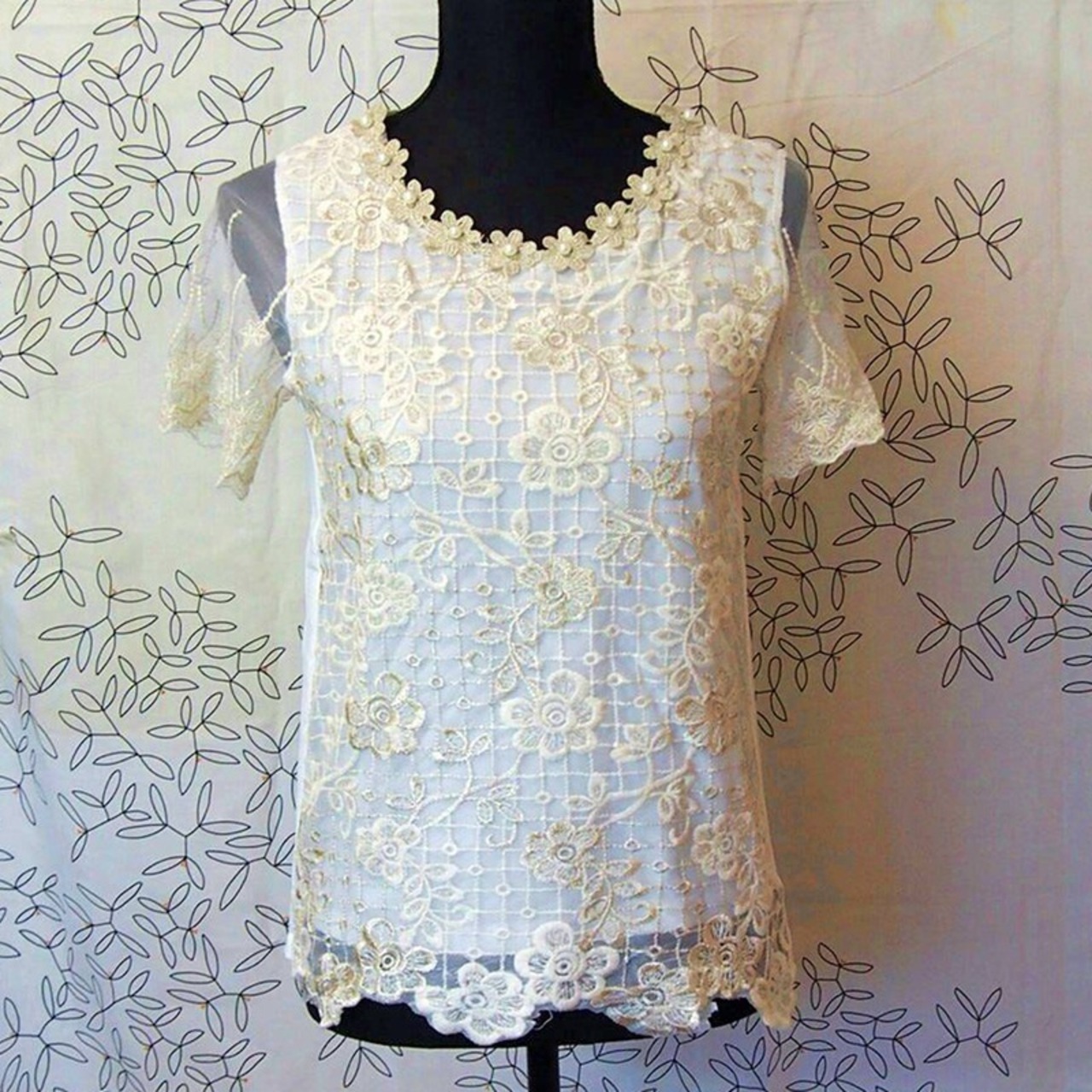 シフォン 半袖 花柄 レース シャツ ビジュー シースルー