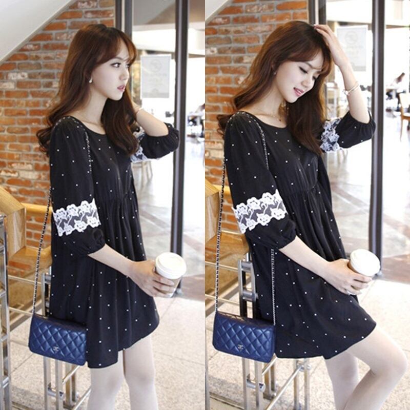 ドット柄の生地に袖に付いたレース、ふわりとしたフレアシルエットが