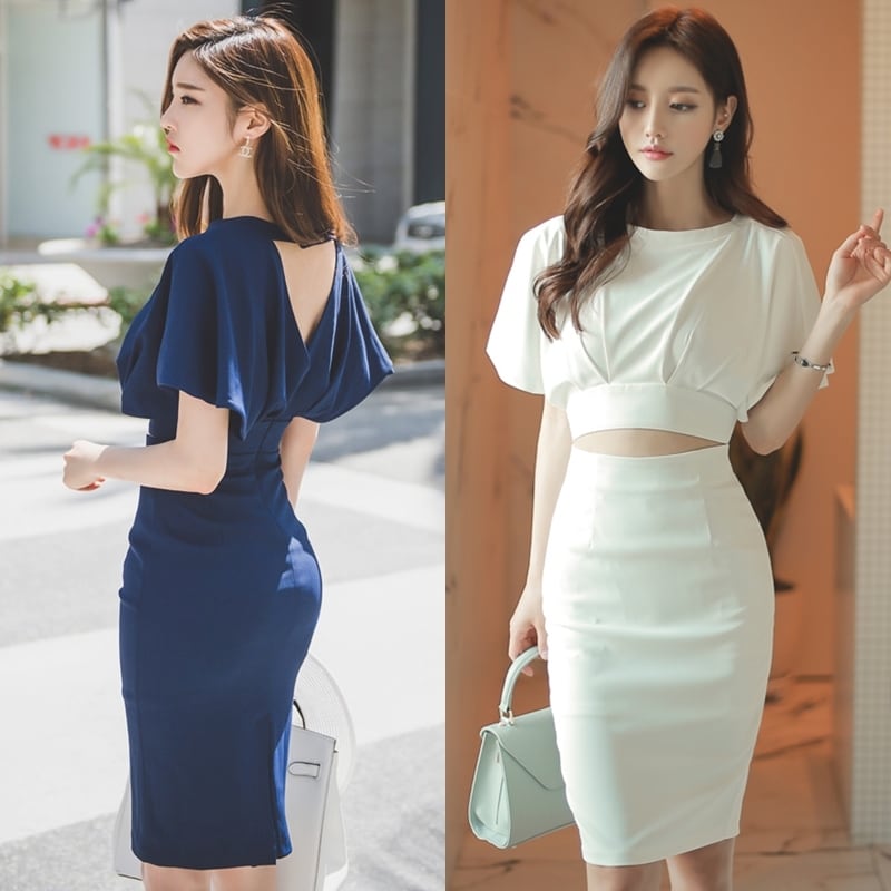 半袖 フレアスリーブ Uネック タイト ミドル丈 ワンピース