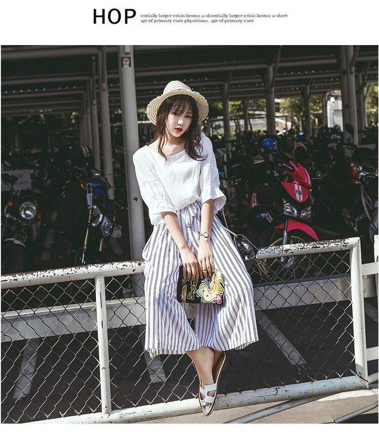 セットアップ Uネック 五分袖 ベルスリーブ トップス ストライプ ガウチョパンツ