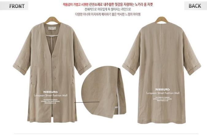 【取り寄せ】七分袖 ノーカラー ロング コート 無地 リネン ボタン Vネック